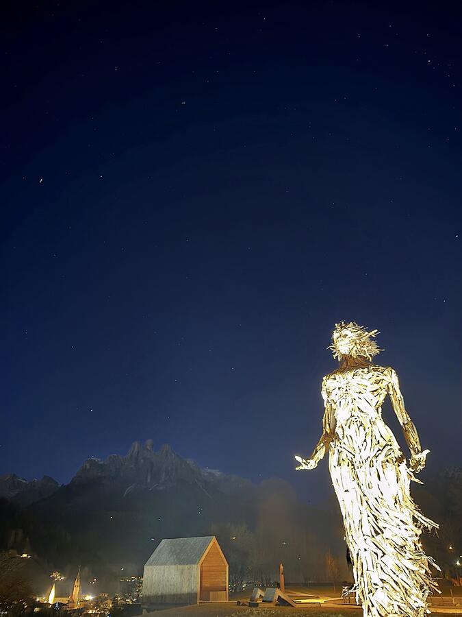 La scultura sembra emergere dal territorio stesso, come se fosse sempre stata lì, in attesa di essere rivelata. Una figura che unisce arte contemporanea, mito e paesaggio alpino , diventando uno dei simboli più intensi dell'arte Vaia in Trentino.
